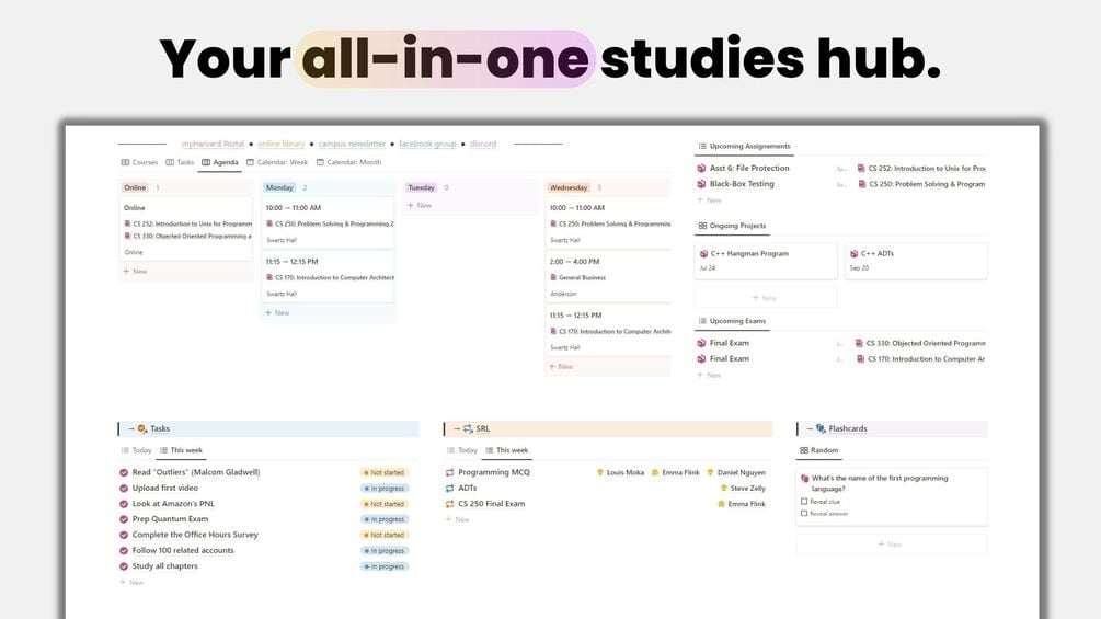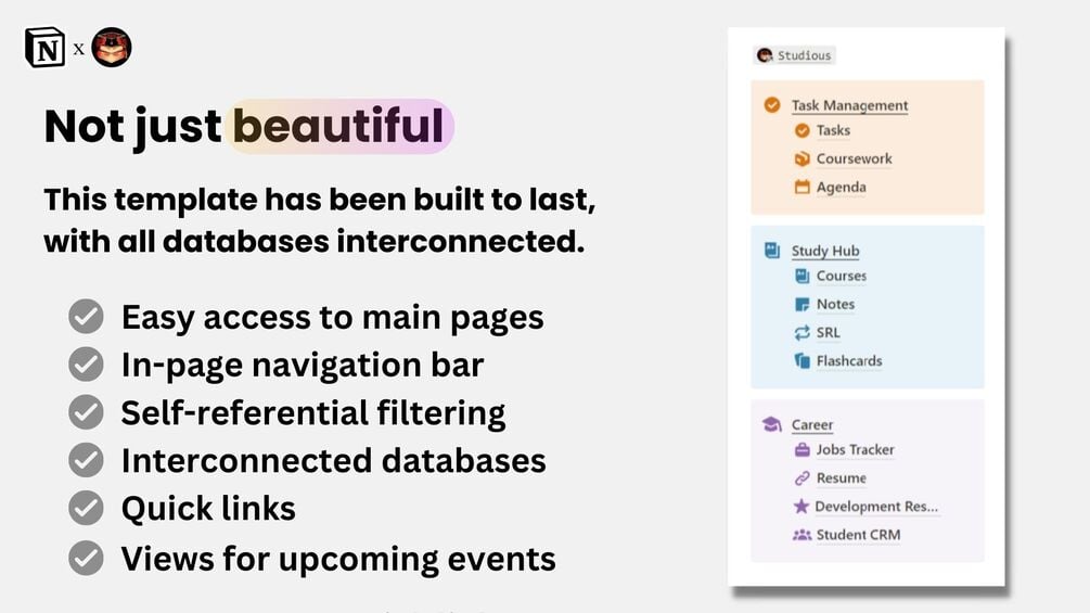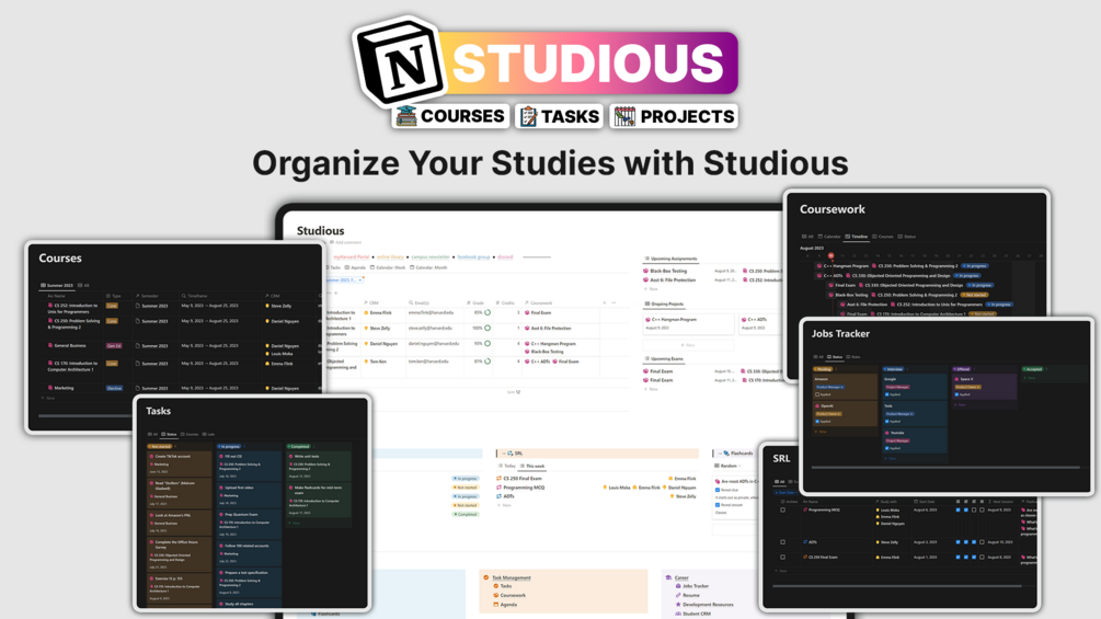 Studious is a Notion system made to help you manage your entire student life: courses, projects, assignments, exams, notes, and more, complete with a study hub, career resources, and jobs tracker.